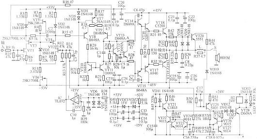 V6一V9等組成輸出級(jí),采用雙極型晶體管與場(chǎng)效應(yīng)管混的辦法是加入阻尼電阻,即在柵極串接一只電阻(一般不超過1kQ)。