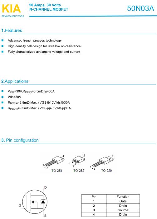 安定器MOS管 50N03 50A/30V規(guī)格書-防反接產(chǎn)品 12V輸入方案-KIA MOS管