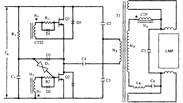 圖16.23 電壓饋電串聯諧振半橋拓撲 。開端啟動時,串聯諧振電路包含L、Cr 和 Cl。當燈點亮后,就只需Cr,諧振頻率降落。電流變壓器初級C CTP)起限流作用,它也充任基極比例驅動變壓器,由于它的臣比NA/Na剛好等于晶體管最小的盧值圖16.23顯現了→個驅動LED燈管的變壓器,它提供直流隔離 。固然在各種文獻中非隔離式 MOS電路被普遍討論研討,但目前不隔離且沒有變壓器的電路并沒有被普遍認同 。從圖1能夠明顯看出,無論開關管導通還是關斷,其最大的電壓應力都是1年。而取得該優點的代價是,在導通時,與在電壓饋電串聯推挽拓撲中討論的相似 ,串聯諧振電路同 樣會產生高幅值的尖峰電流沖擊 。從圖16.23能夠看出,串聯諧振電路位于變壓器的次級,由Lr、Cr和電流變壓器的初級及與燈的阻抗并聯的Cl共同組成。大電流呈往常導通沖擊時 ,這是由于在導通霎時,燈管的阻抗很大,等效阻抗R,=[RL/(1+Q2)](圖16.21Cb)中的(2))會很小。這是由于Q=RLCl很大,所以電阻R,很小。這樣在導通霎時,串聯諧振回路中的等效阻抗僅包含很小的R,C疏忽電流變壓器的初級阻抗)。
