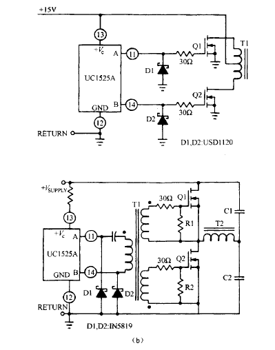 第二代 PWM 芯片,如 Unitrode 公司生產(chǎn)的 UC1525A[坷 ,具有內(nèi)置圖騰柱結(jié)構(gòu) ,它由 NPN 型反相器疊加 NPN 型射極跟隨器組成 。如圖 9.7 ( a ) 所示,射極跟隨器和反相器由相 位相差 180。的信號(hào)驅(qū)動(dòng),交錯(cuò)導(dǎo)通。通過使用具有兩個(gè)互相隔離的次級(jí)的變壓器( 圖 9.7( b) ) 驅(qū)動(dòng)具有不同直流電壓水平的半橋或全橋電路的上 F兩只晶體管。類似地 ,推挽電路也可以 驅(qū)動(dòng)具有相同直流電壓的 MOSFET 管。