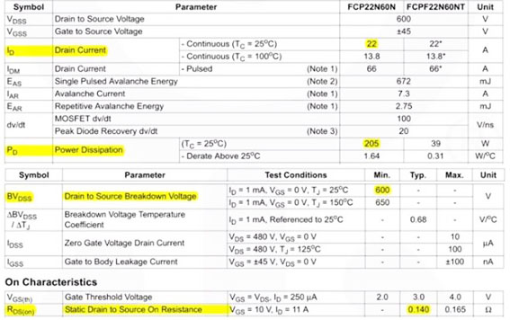 以22N60N這款MOSFET為例,我們查看數據手冊,連續工作模式的相關參數如下: