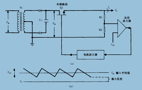 圖1.1(a)Ql與負(fù)載串聯(lián)起可變電阻作用:負(fù)反饋環(huán)通過(guò)改變其阻值以保持輸出電壓Vo的穩(wěn)定。(b)線性調(diào)整器的壓差。若串聯(lián)NPN型晶體管,則應(yīng)保證交流輸入電壓Vac最低時(shí)對(duì)應(yīng)的直流電壓的紋波谷值與輸出電壓Vo之間有2.5V的壓差反饋回路完全是直流耦合。由于整個(gè)回路沒(méi)有開(kāi)關(guān)器件,所以回路各點(diǎn)的直流電壓都可預(yù)測(cè)和計(jì)算。電路中沒(méi)有變壓器并且不存在引起RFI噪聲的瞬態(tài)尖峰電壓或電流。由于晶體管不工作在開(kāi)關(guān)狀態(tài),所以不存在晶體管的下降電流和上升電壓瞬時(shí)重疊造成的交流開(kāi)關(guān)損耗。所有功耗只是電路各元件的直流損耗,很容易計(jì)算。