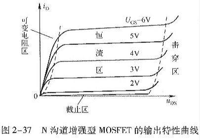 N溝道MOS管的輸出特性曲線如圖2-37所示。與結(jié)型場(chǎng)效應(yīng)管的輸出特性相似,它也分為恒流區(qū)、叮變電阻區(qū)、截止區(qū)和擊穿區(qū)。其特性如下所示。