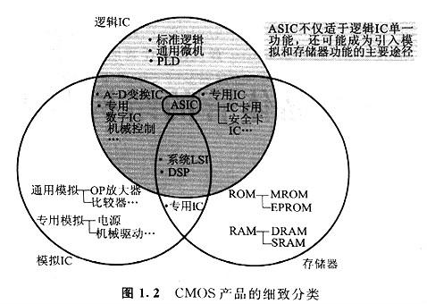 如圖1.1所示,CMOS產(chǎn)品能夠分為模仿(線性)IC,邏輯IC和存儲器。邏輯IC中包含標(biāo)準(zhǔn)邏輯lC、PLD(Programmablc LOgic Device)、ASIC(Application SpecificIC)/定制LSI、專用)C、微處理器,DSP(Digital Signal Processor),以及體系LSI等。
