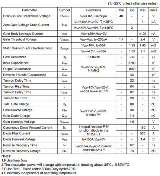 KCX2704A漏源擊穿電壓40V,漏極電流最大為150A;開啟延遲典型值為22nS,關斷延遲時間典型值為87nS,上升時間64nS,下降時間28nS,反向傳輸電容43pF,反向恢復時間67nS,正向電壓的典型值1.4V。