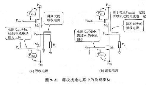 如圖9.21(a)所示,當(dāng)Vout降低,自RL流入輸出端的電流(吸收電流)增加時(shí),n溝MOS晶體管M2的柵極電壓上升。就是說(shuō),VGS2增加,M2的電流驅(qū)動(dòng)才干增強(qiáng),能夠流過(guò)大的吸收電流。