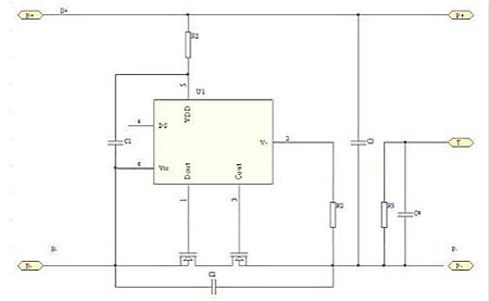 保護板有兩個核心部件:一塊保護IC,它是由精確的比較器來獲得可靠的保護參數;另外是MOSFET串在主充放電回路中擔當高速開關,執(zhí)行保護動作。電路原理圖如下: