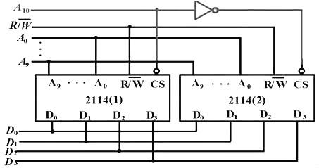 例: 用2片2114(1024×4bit)RAM構成2048×4bit的RAM