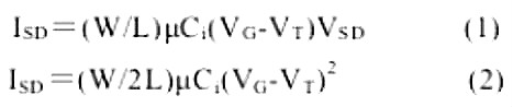 其中,Vr是閾值電壓,Ci是絕緣層單位面積的電容,u是載流子遷移率。當Va大于閾值電壓且固定在某-一數值時,Vsp很?。▅Vspl《|VG-VT),此時,導電溝道中的電荷密度是線性減少,有機場效應晶體管處于線性工作區,漏電流可以通過方程式