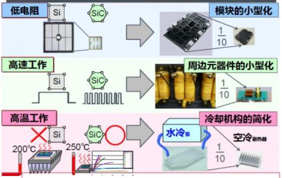 低電阻特性,SiC具有低電阻特性,在同等電壓和電流等級的MOSFET中,SiC MOSFET 的內阻要幾倍小于Si MOSFET 的內阻,且SiC的模塊體積小型化,有利于增加系統功率密度。