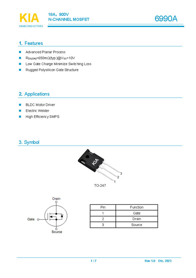 參數(shù): ID(A): 18 BVDSS(V): 900 RDS(ON): 650mΩ Qg(nC): 75 Package: TO-247