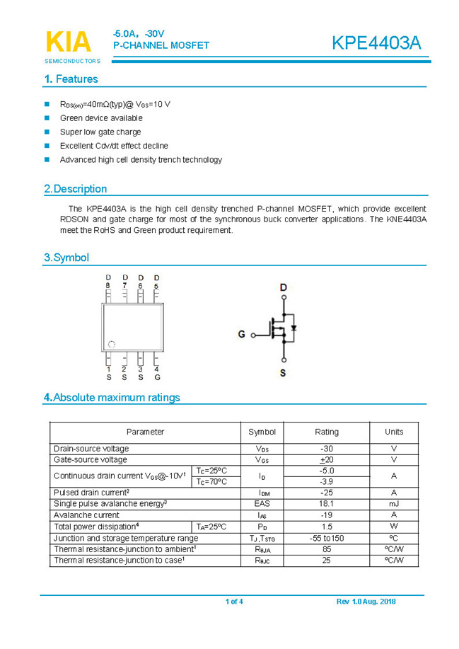 參數: ID(A): -5    BVDSS(V): -30    RDS(ON): 40mΩ    Qg(nC): 6.5    Package: SOP-8
