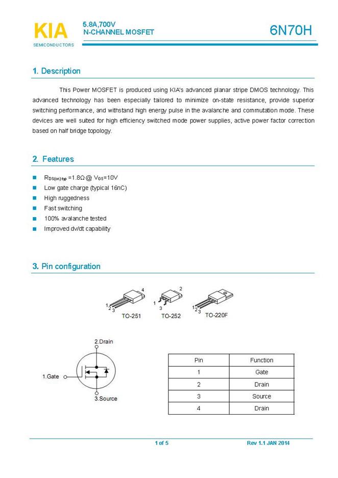 參數: ID(A): 5.8    BVDSS(V): 700    RDS(ON): 2.3    Qg(nC): 16    Package: TO-251、TO-252、TO-220F