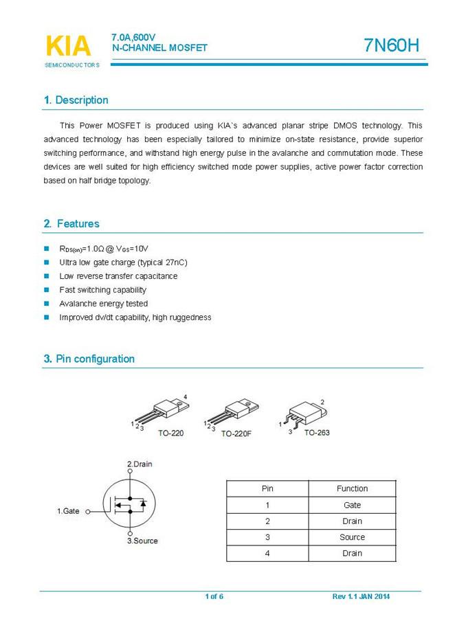 參數: ID(A): 7    BVDSS(V): 600    RDS(ON): 1.2    Qg(nC): 27    Package: TO-263、TO-220、TO-220F